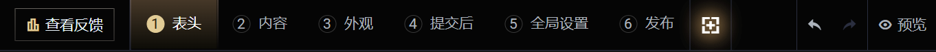 表单编辑环节一览:①表头  ②内容  ③外观  ④提交后  ⑤全局设置  ⑥发布