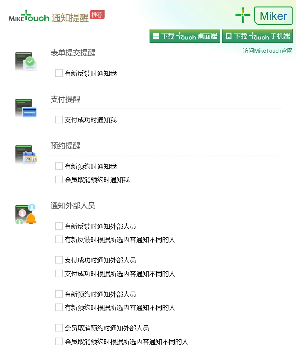 您还可以免费通过MikeTouch实时接收反馈提醒,若表单开启了“在线支付”或“预约”等功能,还可以只在支付成功时/有新预约/会员取消预约时推送通知提醒消息,精准关注重点消息。