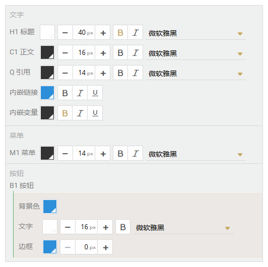 - 按钮类的样式包括B1~B3,可以修改按钮的背景色(也就是按钮本身的颜色),按钮中文字的颜色、大小、加粗和字体,以及按钮边框的颜色和宽度;按钮边框默认宽度为0,此时不显示边框。
