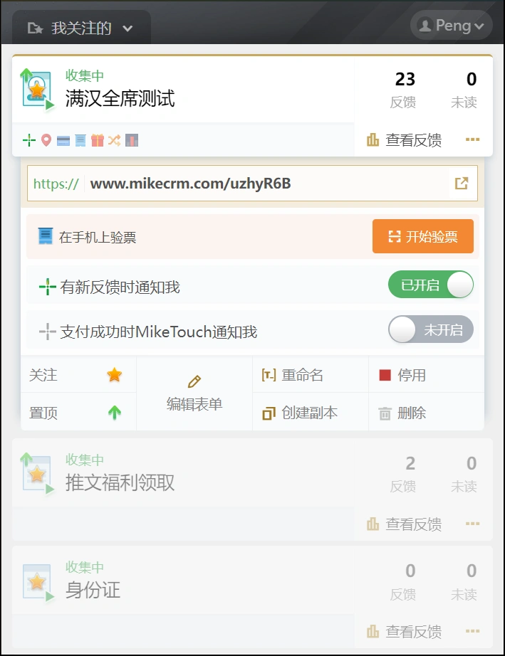 • 反馈通知:快速开启/关闭当前表单的反馈通知提醒,通过MikeTouch稳定实时地接收提醒消息