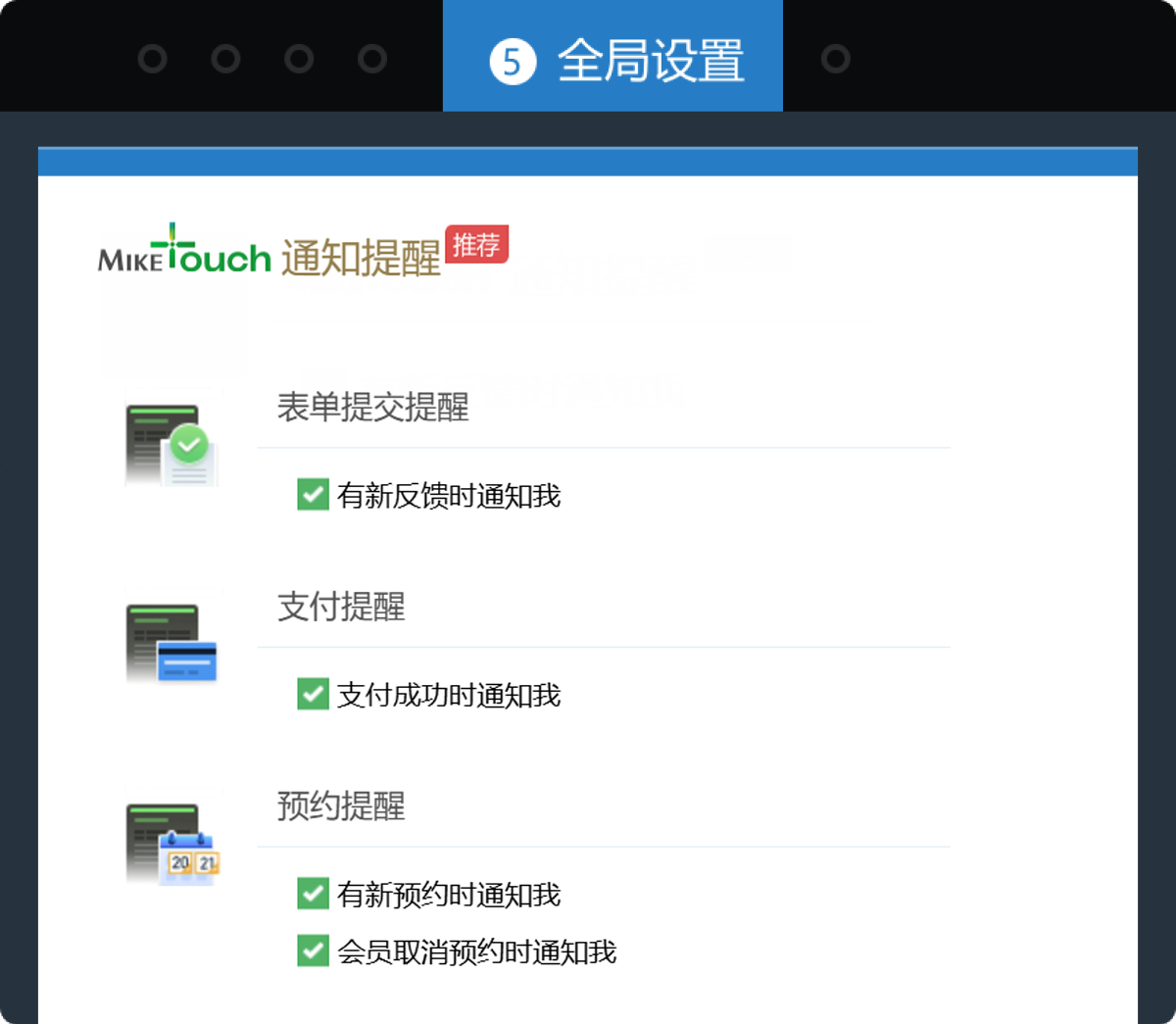 在表单的全局设置中,会看到MikeTouch通知提醒设置。点击勾选“有新反馈时通知我”,就可以接收MikeTouch的反馈提醒啦~