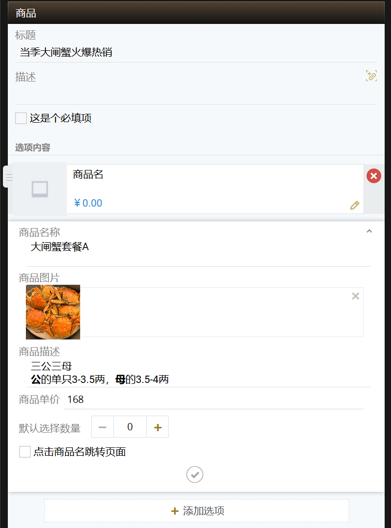 商品组件有着大部分组件通用的一些编辑项目:标题、描述和设置是否必填。此外,商品组件还跟选择类组件一样,可以添加“选项”,不同的是,商品组件的每一个“选项”,都对应着一件“商品”。
