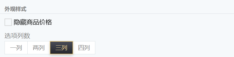 在外观样式设置中,可以“隐藏商品价格”,以及修改“选项列数”。