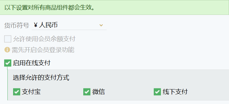 在启用在线支付前,可以调整商品价格所使用的货币符号,不仅仅是人民币¥符号,美元$、欧元€、英镑£等全球各种货币符号都可以选择设置,还可以自定义添加货币符号。
