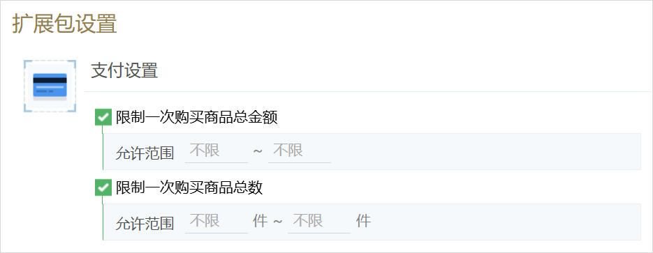 启用在线支付后,还可以在表单全局设置-扩展包设置-支付设置中,对一次购买的商品总金额和总数量进行范围控制,统一限制最终订单的金额范围和购买商品数量范围。