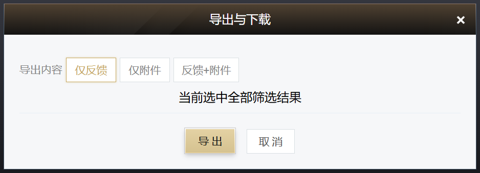 点击“导出与下载”就能够将您选中的反馈详情以及反馈中包含的附件下载到本地。“导出与下载”功能很好用,配合部分显示和结构化筛选功能,可以很方便地将反馈细分后导出,便于存档。