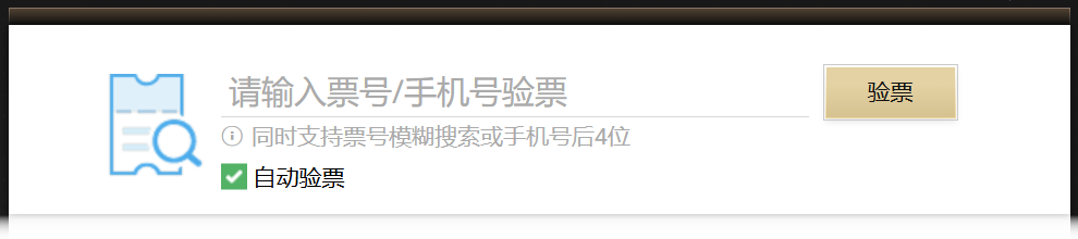 勾选自动验票时,操作按钮是“验票”,当票号的搜索结果唯一时,会自动完成验票,将“可用”状态的票变为“已使用”。未勾选时,操作按钮是“查询”,点击后只是返回该票号的查询结果,需要进一步确认后,在查询结果中手动进行验票操作。