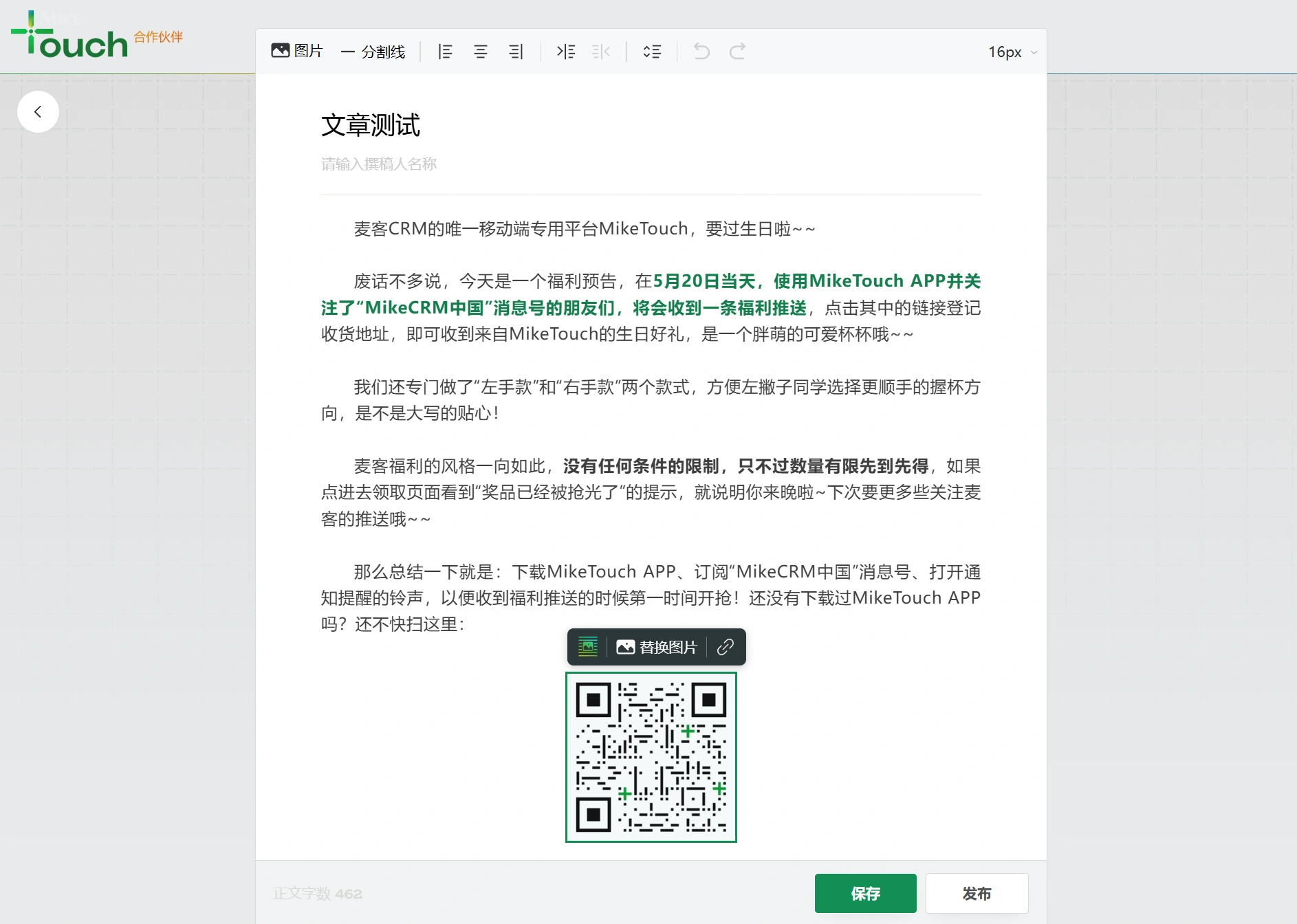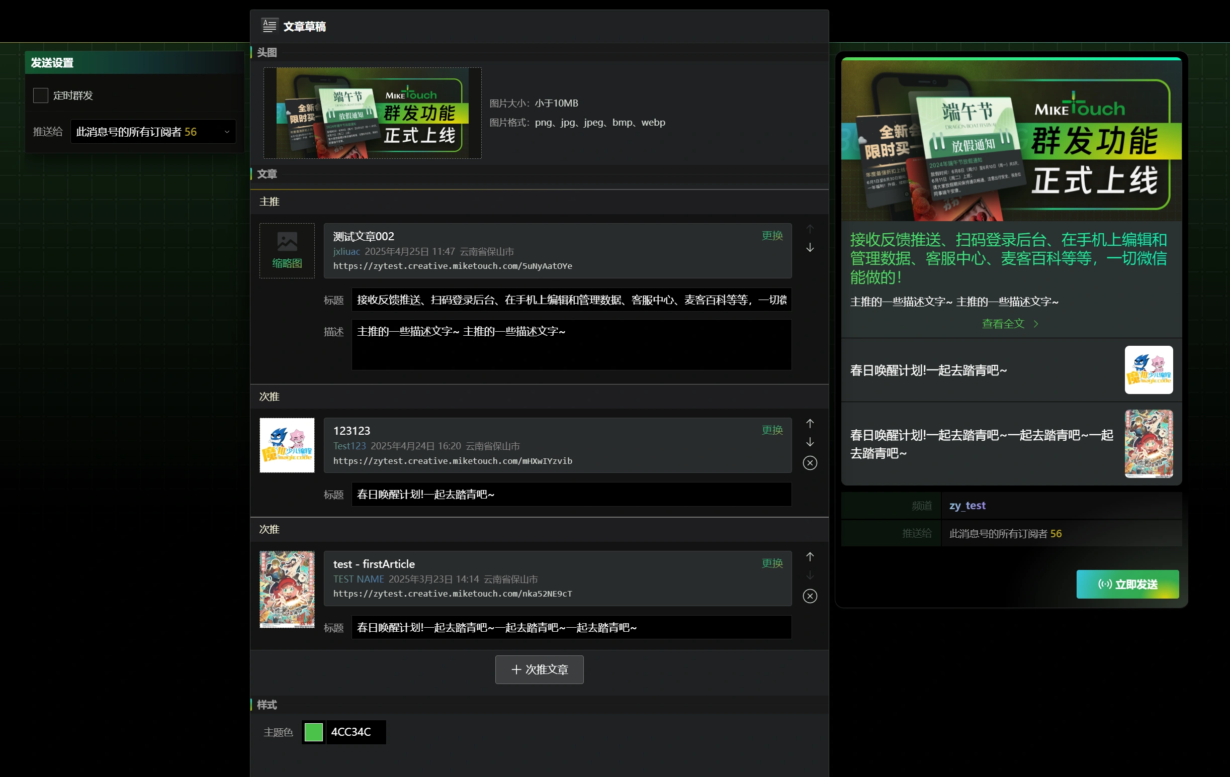 MikeTouch可以向订阅用户群发消息,文章也可以作为消息内容进行发送。