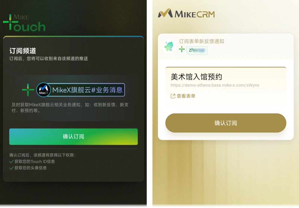 MikeTouch的各种消息都是通过“消息号”和“频道”进行推送的,要接收表单反馈提醒,您需要订阅对应的消息号和频道(下图左)。